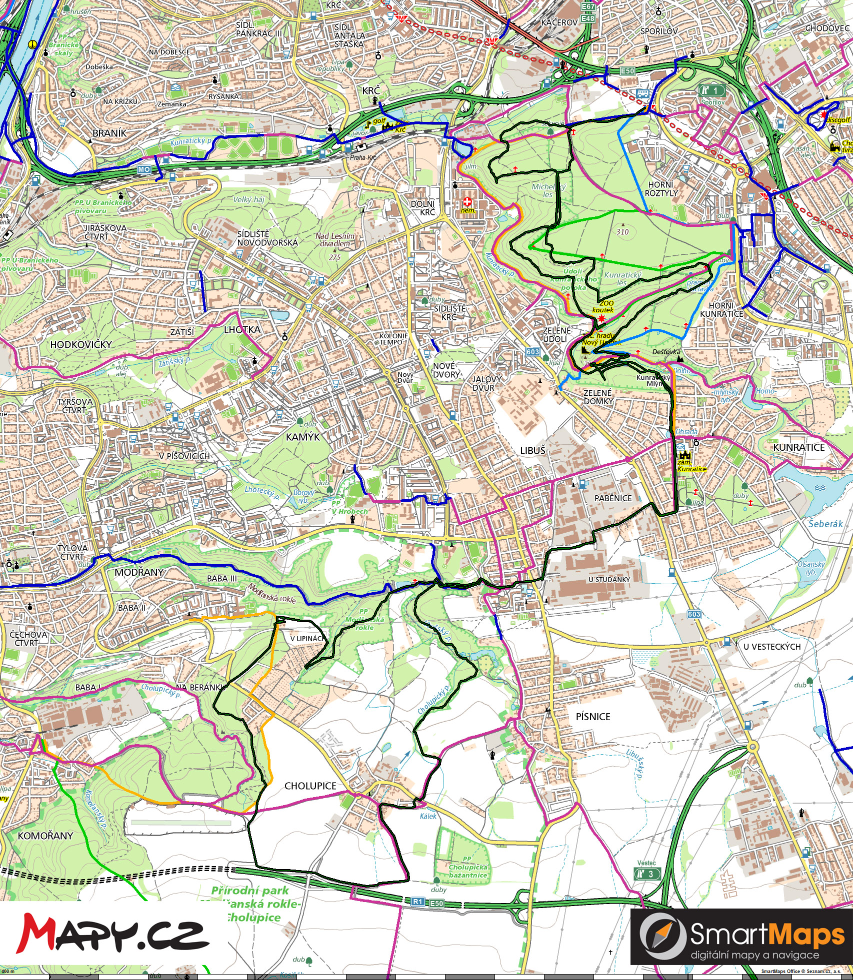 To je pro něj dost zásadní, nemusí se tak při svém výletu proplétat mezi davy dalších přírody chtivých návštěvníků. S mírným nabíráním výškových metrů se dostáváme až do Cholupic a kousek za nimi na val odhlučňující pražský silniční okruh. Po tomto valu objíždíme zástavbu a znovu se noříme do lesa. Ještě několikrát se přiblížíme až k hranici zahrad této lokality, ale vždy opět zmizíme do lůna lesa. Je celkem zajímavé, že prakticky v sousedství všudypřítomného lomozu civilizace a jen nějaké dva tři kilometry vzdušnou čarou od Vltavy je člověk najednou prost všech rušivých vjemů.